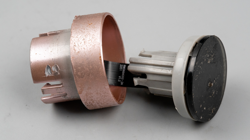 主板上的FPC排线延伸至旋钮内部,外面的粉色结构可自由旋转,而旋转过程中,内部那个带有屏幕的灰色结构则保持固定,不会跟随旋转。