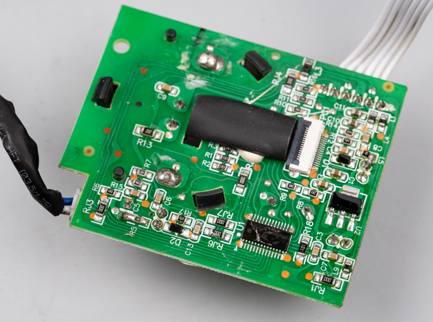 接下来看控制主板,这一面装有主控制芯片和屏幕FPC排线连接器,为了保护排线,连接器上的FPC排线上也套有一层热缩管,起到绝缘和防拉扯的作用。