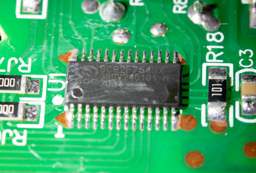这款控制主板的主控制芯片,采用的是赛元公司生产的SC92F7543X系列单片机,该芯片基于51内核设计,配备12位ADC(模数转换器),封装形式为TSSOP-28,性能稳定,能够满足破壁机的控制需求。