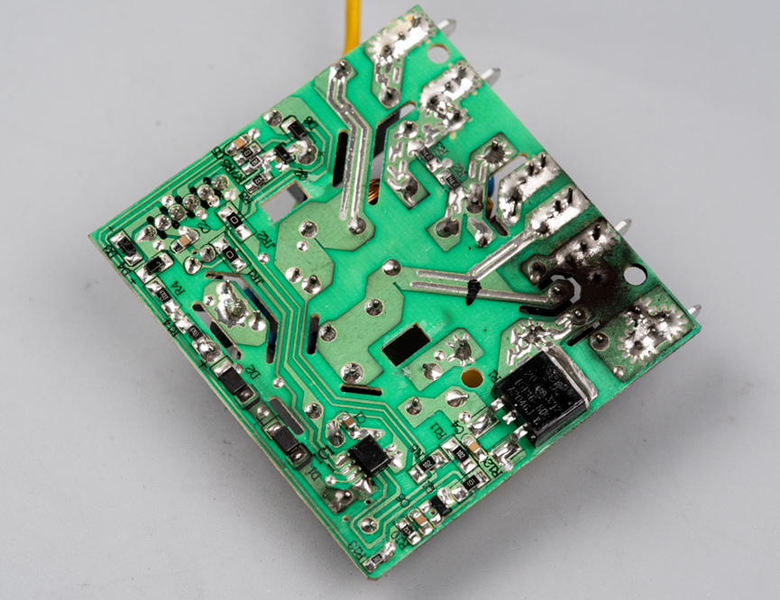 这是电源电路板的背面,背面主要分布着各类焊点和线路,整体布局规整,没有多余的线路杂乱分布。