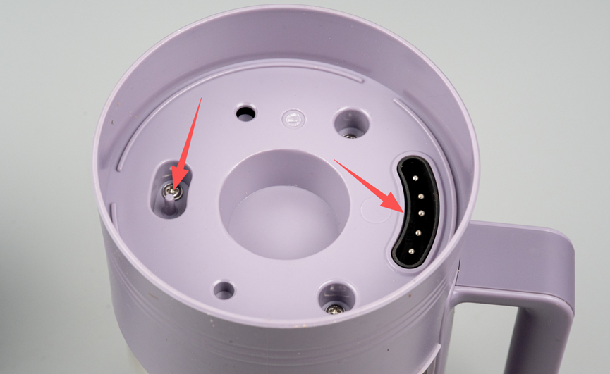我们之前在底座平面上看到的适配检测开关,在拆开底盖后看得更加清楚。它通过一根弹簧向上托起,当烧水壶或破壁机放置到底座上时,会向下按压检测开关,触发其内部的轻触开关闭合。
