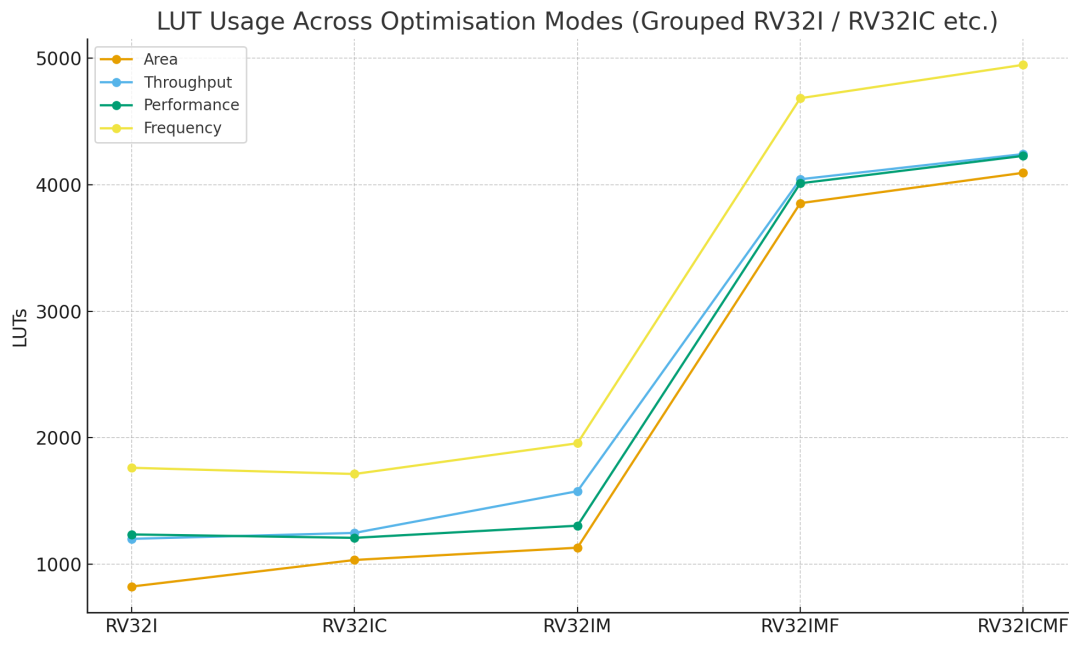 以下为四种流水线配置下,主要 ISA 组合的 LUT、FF、BRAM、DSP 使用情况。从结果中可以看出一些趋势: