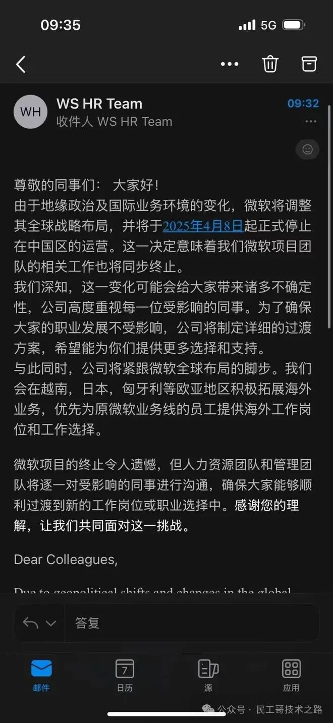 2025年4月7日,上海微创软件股份有限公司发布内部邮件,称因“地缘政治及国际业务环境变化”,微软将调整全球战略布局,并于2025年4月8日起正式停止中国区运营。