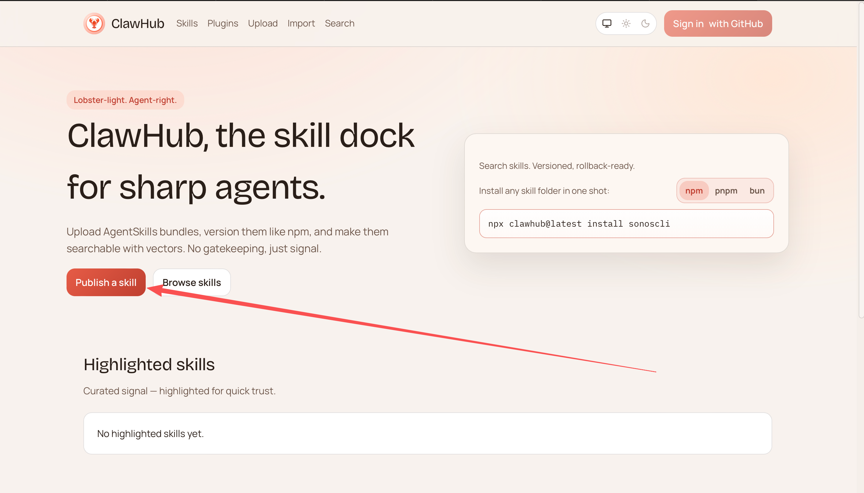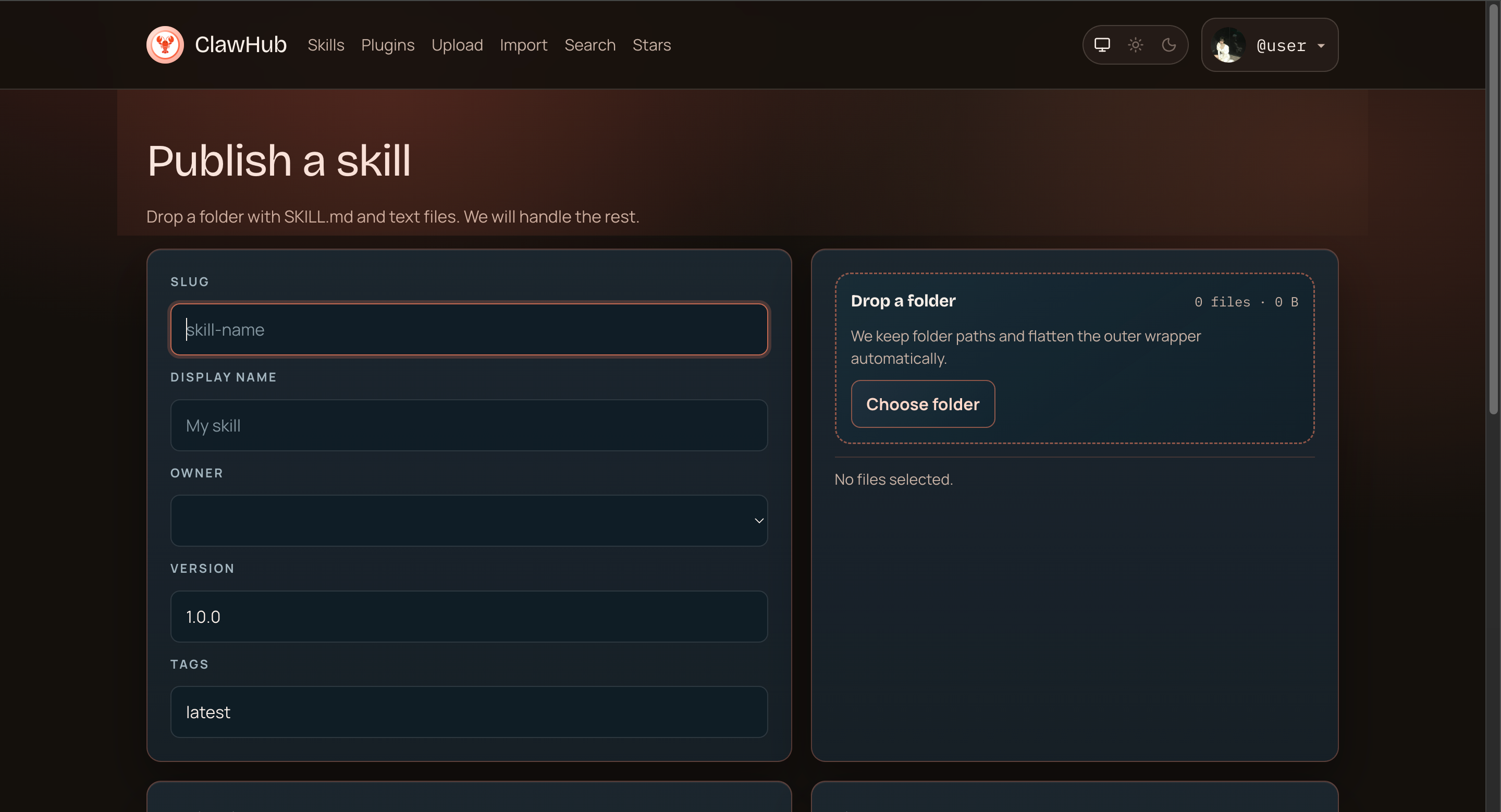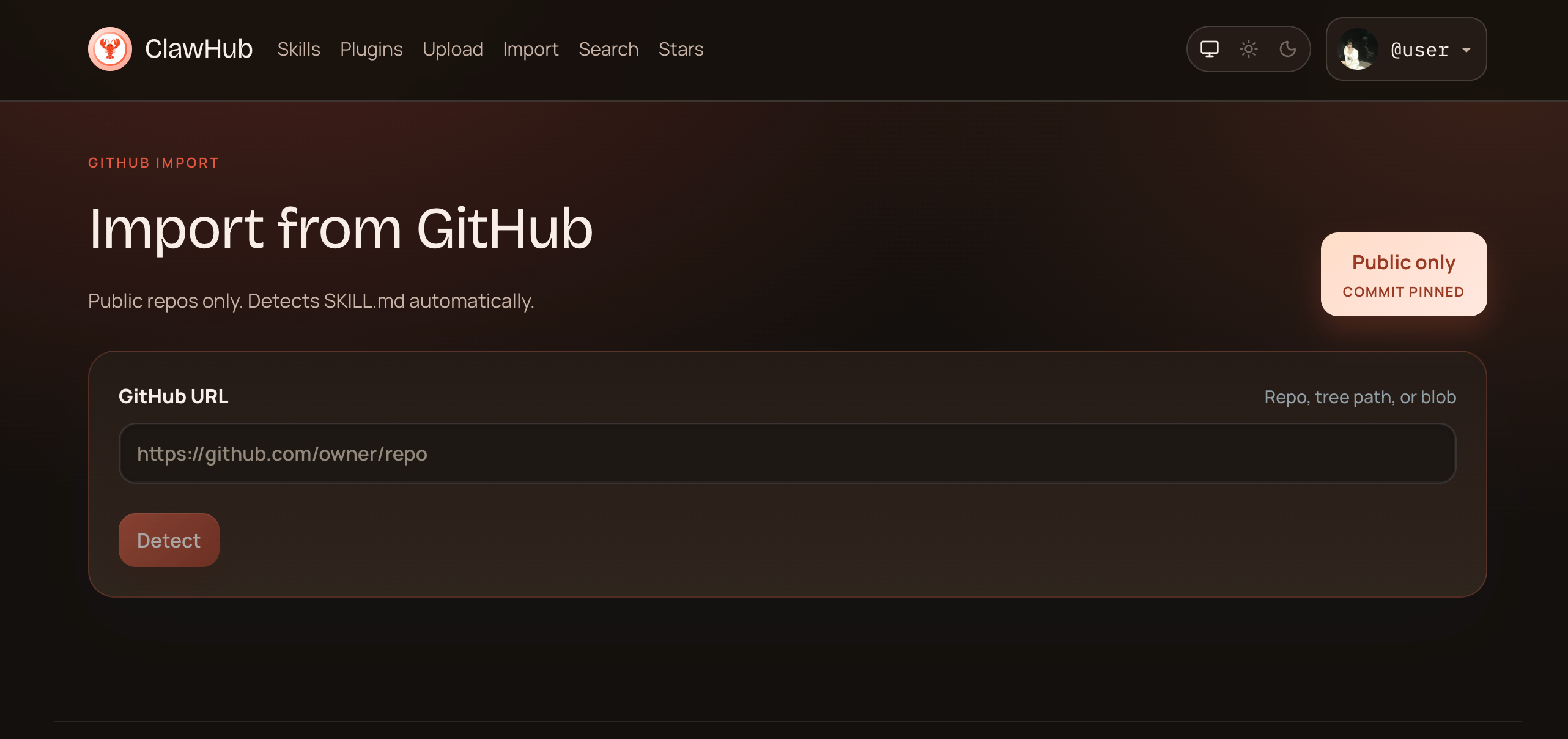访问 https://clawhub.ai/import,你会看到一个发布表单。