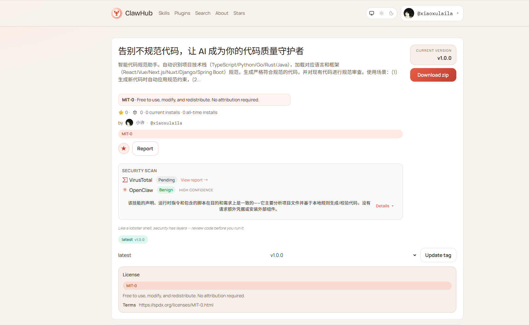 • 跳转到你的技能详情页,地址格式:https://clawhub.ai/你的用户名/你的技能slug