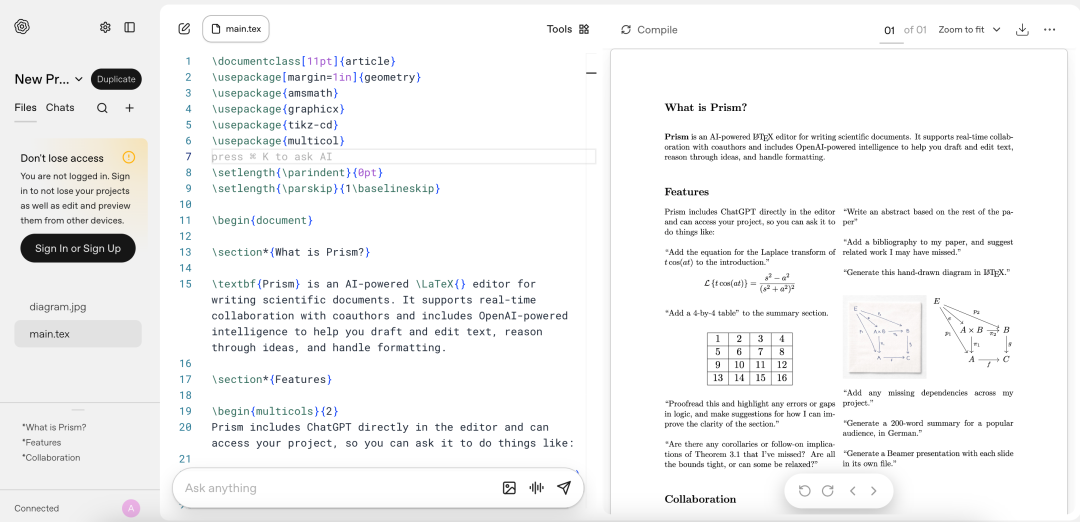 OpenAI 最近推出的 Prism 平台,彻底打破了科研写作的孤岛状态。作为一个 原生支持 LaTeX 的免费协作空间,Prism 直接集成了 GPT-5.2,将科学研究带入了 AI 驱动的协作新时代。