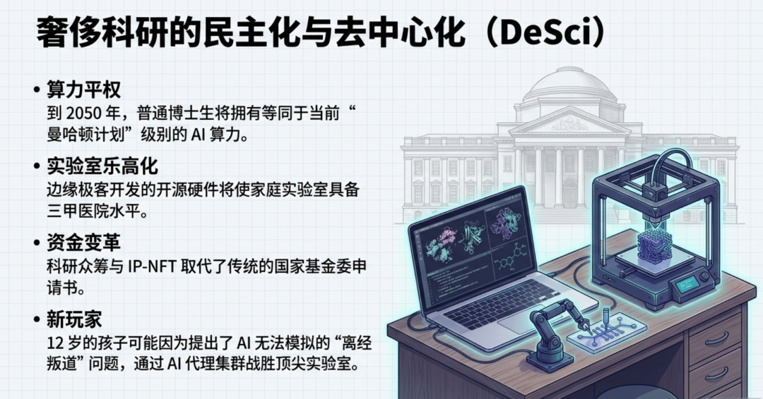 随着实验成本下降与协作工具(如 Prism)普及,大学围墙将逐渐崩塌 。科学将回归其本源——