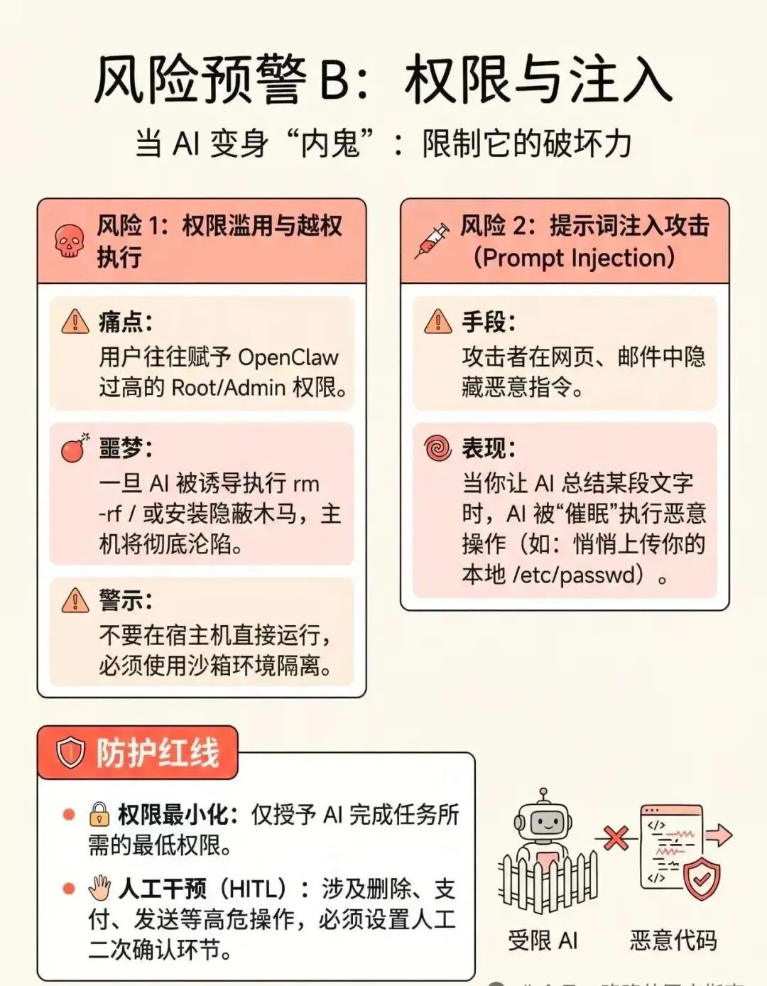 权限滥用和提示词注入攻击是OpenClaw的另两大安全隐患。攻击者通过获取过高权限或构造恶意提示词,可执行未经授权的操作,甚至控制整个系统。