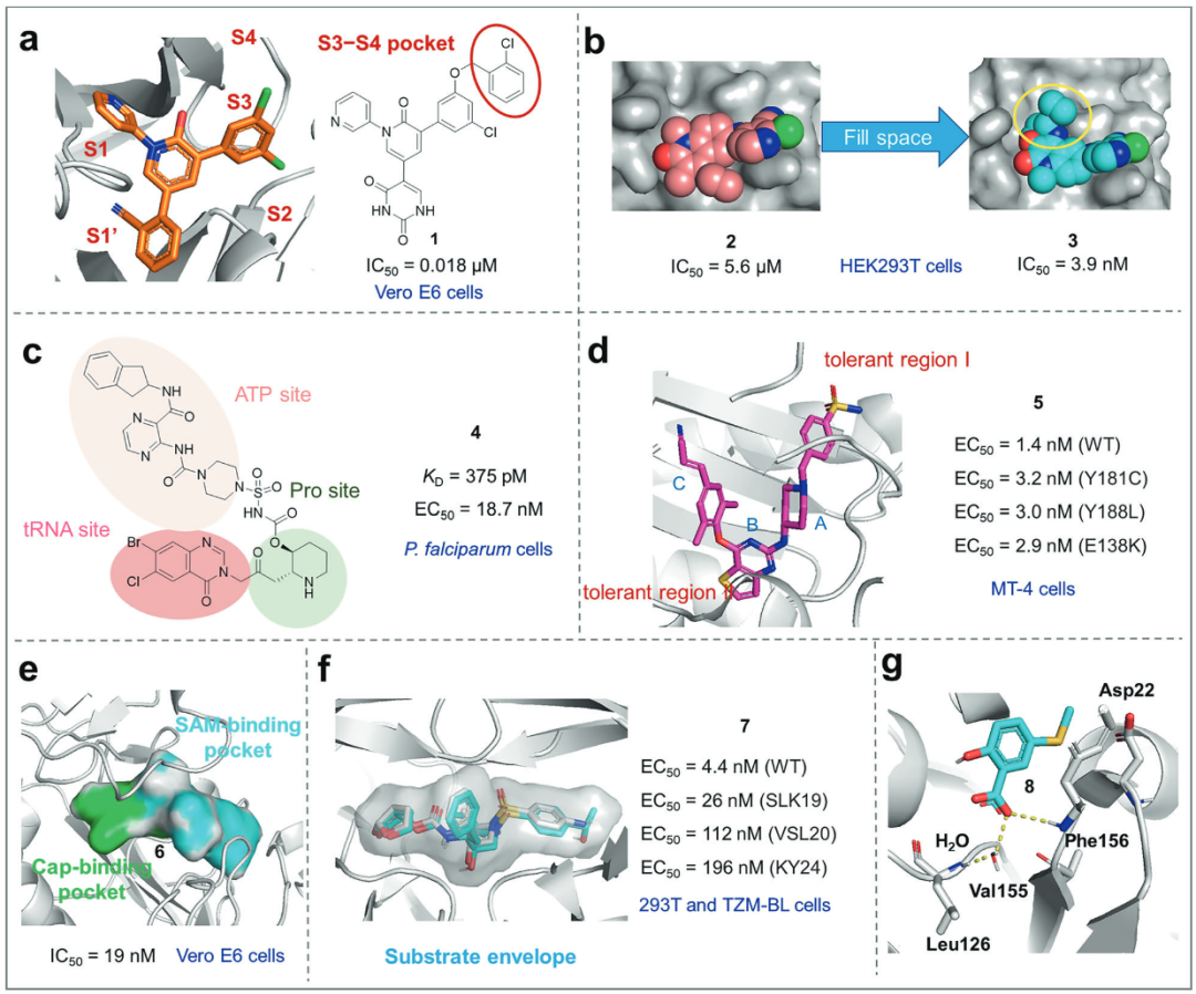 目前,仍需要廉价、便利且有效的治疗策略来应对病毒,包括能够解决新突变引起的耐药性的策略。作者总结了抗病毒药物发现的进展和未来趋势,希望能为药物开发提供一些帮助。这些策略包括靶向新位点、利用溶剂暴露区、底物结构、共价结合策略和多价配体的技术。此外,新兴方法如虚拟筛选和靶向蛋白质/RNA降解已被用来遏制耐药性的出现。