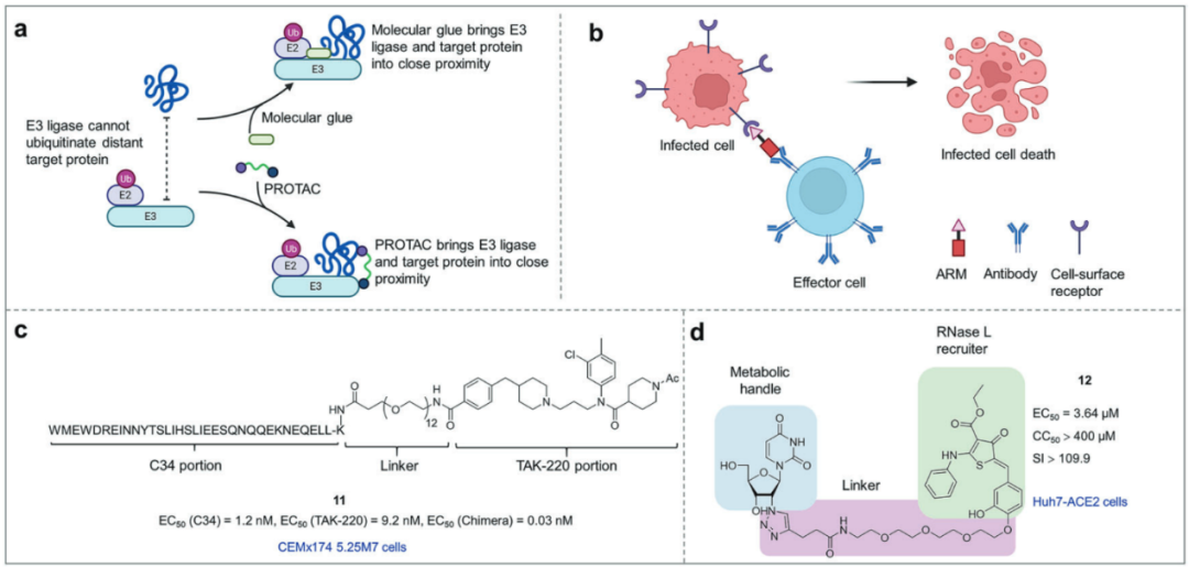 文章介绍了抗病毒药物设计中几种新型作用机制。具体来说,多特异性策略通过同时结合多个目标或效应器来发挥作用,例如将目标蛋白招募到特定细胞器进行降解或将药物定向递送到特定部位以减少副作用。它们虽能提高疗效,但设计和开发更为复杂。靶向蛋白质降解技术包括PROTAC及分子胶。抗体招募分子(ARM)将能招募内源性抗体的分子与靶向病毒表面蛋白的分子结合,激活免疫系统清除病毒感染的细胞。抗体-药物偶联(ADC)利用抗体的靶向性,将高毒性药物精确递送到病毒感染细胞,通过释放药物杀伤细胞。此外,多靶点短肽抑制剂将具有不同作用机制(如抑制病毒融合、拮抗辅助受体)的短肽整合到一个分子中,产生协同增效的抗病毒效果。靶向RNA的降解策略设计能识别并结合特定病毒RNA结构的小分子,通过连接一个能切割RNA的效应分子,实现对病毒RNA的直接降解,从而抑制病毒复制。