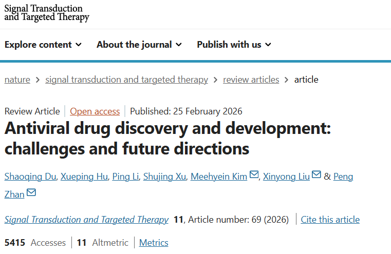 2026年2月25日,山东大学、韩国化学技术研究所及青岛大学的研究团队在《Signal Transduction and Targeted Therapy》上发表综述文章,题为“Antiviral drug discovery and development: challenges and future directions”,其中韩国化学技术研究所的Meehyein Kim与山东大学的刘新泳、展鹏为共同通讯作者。