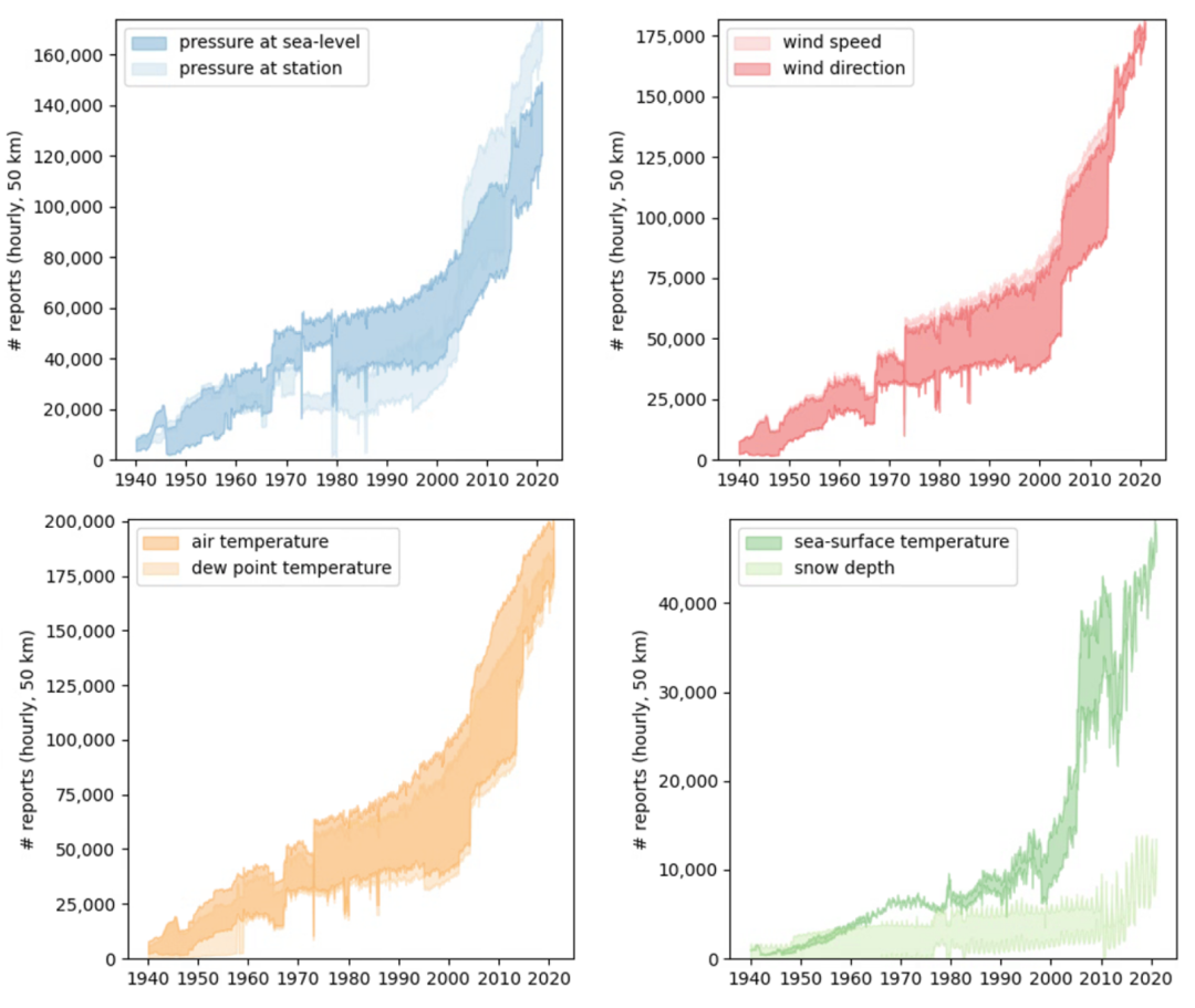 ERA6的一项重大创新是纳入了 rescued(抢救)、reprocessed(再处理)以及新可用的历史观测数据(例如,由于数据开放政策或国际数据交换协议的结果)。这些包括1979年前的早期卫星记录、来自C3S合同的再处理数据记录,以及过去实地测量档案的校正版本。这项工作结合增强的预报能力,确保了气候记录早期十年的更大连续性和准确性,并有助于纠正原始档案中的地理位置和时间误差。