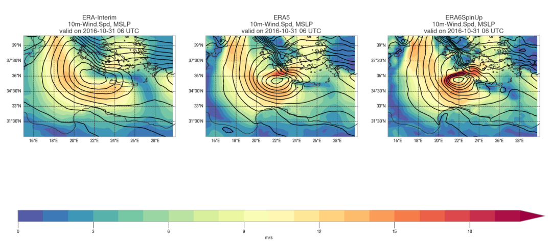 Medicane Trixie(地中海飓风Trixie)在ERA-Interim(左)、ERA5(中)和ERA6(右)中的表征对比。ERA6为这些极端天气提供了更好的表征,包括大气压力(黑色等值线)和风速(彩色阴影)。图片来源:Paul Poli/ECMWF