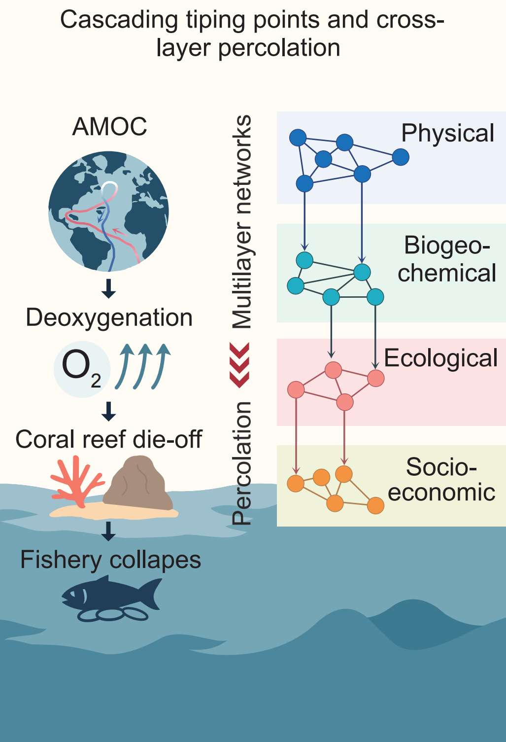 作为一篇观点性文章,该研究并非聚焦单一气候过程的定量模拟,而是立足非线性动力学与统计物理理论,对气候临界点的共性机理进行系统梳理。文章指出,气候临界转变可被视为多稳态系统中的相变过程,其演化特征与分岔理论、临界现象及集体行为密切相关。在此基础上,作者引入渗流理论与多层网络方法,构建了刻画临界扰动在不同地球子系统之间传播的统一概念框架。