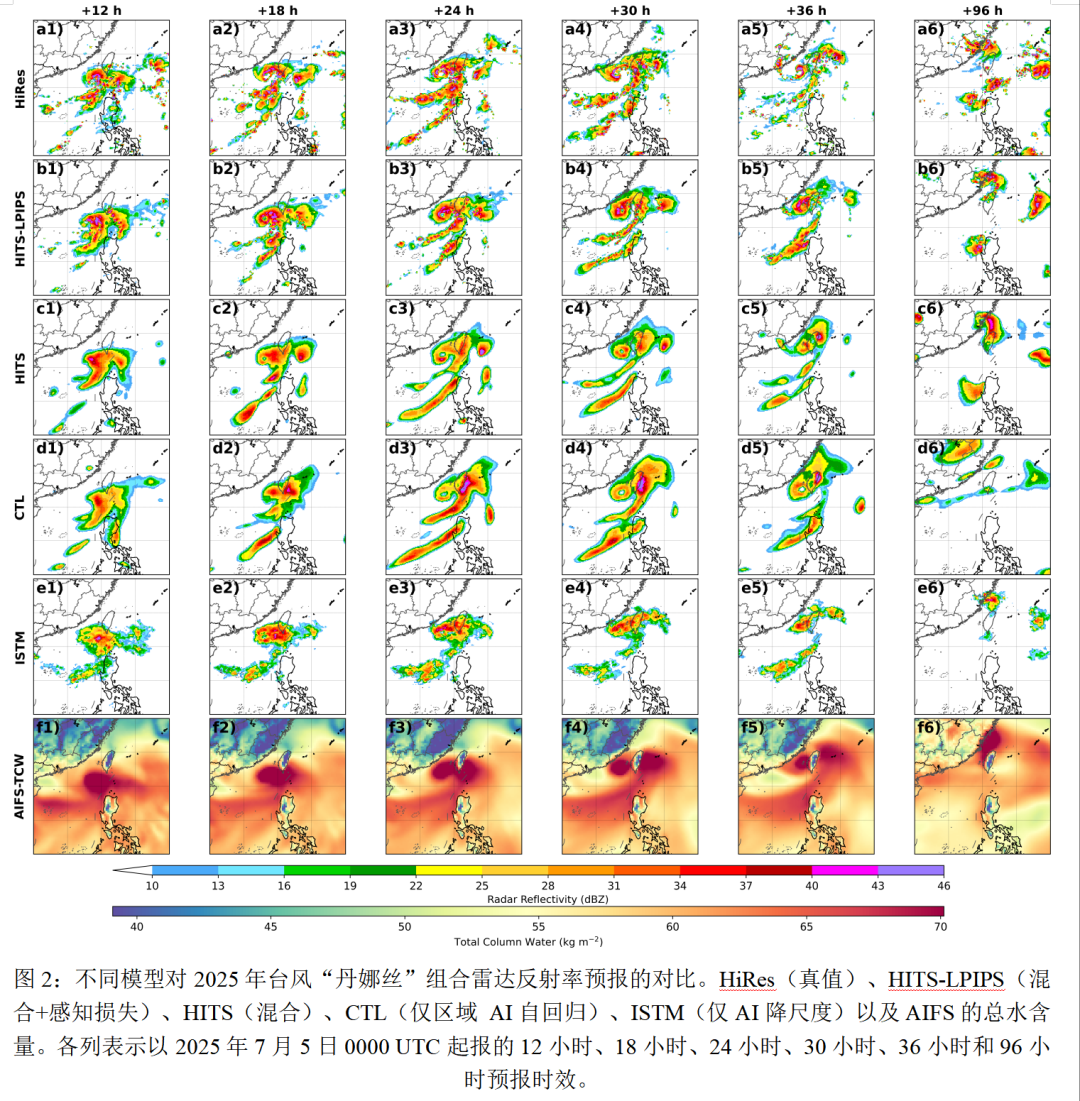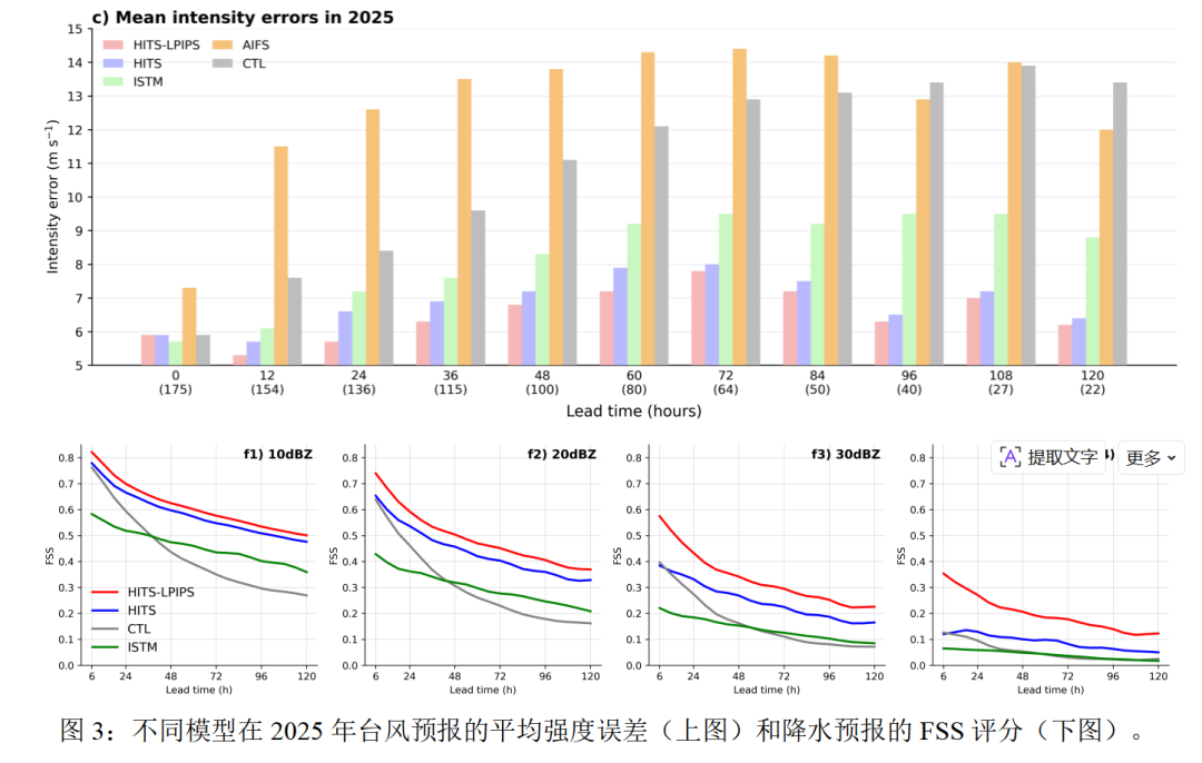 (3)多尺度结构感知的训练策略。为了精准预报台风的多尺度结构特征,本研究采用多尺度结构感知的损失函数(LPIPS)训练了HITS-LPIPS模型,从而保证了台风结构的物理一致性。结果表明,HITS-LPIPS模型在台风强度、降水等方面的预报性能相比于其他模型表现更优(图2-3)。同时,本研究也尝试使用Diffusion Transformer (DiT)来训练,但是由于扩散模型可能会引入随机的小尺度噪声,在台风结构的预报方面表现欠佳。