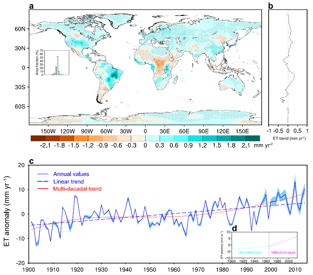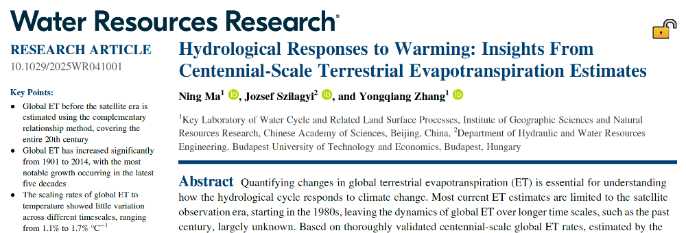 近日,中国科学院地理科学与资源研究所的研究团队在Water Resources Research上发布最新成果,将全球陆地蒸散发的变化追溯至20世纪初。这一研究突破了时间限制,降低了年际/年代际地球系统内部变率对水循环变化趋势认识的不确定性。