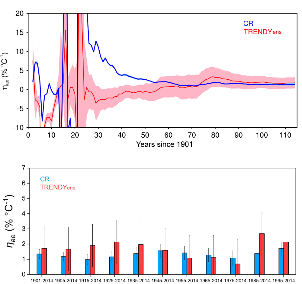 研究还进一步发现,尽管最近几十年的气温和CO2浓度的增速加快,全球陆地蒸散发对温度变化的敏感性在不同时间尺度上基本保持稳定。该结论得到了TRENDY中多个可靠陆面模型的支持。这一结果表明,未来全球陆地蒸散发的变化趋势有望仅通过不确定性较小的温度数据进行有效预测,为未来的水资源管理和应对气候变化提供了重要科学依据。