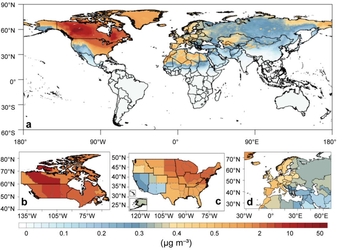 为评估2023年加拿大极端野火事件的健康影响,研究将日均PM2.5浓度高于15微克每立方米(世界卫生组织指导值)且加拿大野火贡献在50%以上的天数定义为“加拿大野火污染日”。在这一标准下,2023年全球共有3.54亿人经受了一天以上的加拿大野火污染,其中加拿大人均约27天暴露在其本地野火污染之中,而美国人均经受了约14天的加拿大野火污染传输暴露。基于污染暴露剂量响应关系估算,北美地区的5400例急性过早死亡以及北美和欧洲地区的6.43万例慢性过早死亡可归因于2023年加拿大极端野火事件导致的PM2.5暴露。