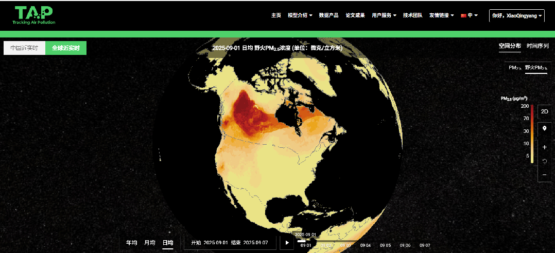 针对这一关键科学问题,清华大学地球系统科学系(以下简称“地学系”)张强课题组联合国内外研究团队,基于长期积累,在自主研发的大气成分近实时追踪技术平台(TAP平台)基础上,构建了多源数据融合的全球野火PM2.5污染近实时反演技术和数据产品,量化了野火烟雾长距离传输的全球影响,揭示了2023年加拿大极端野火对全球人群PM2.5暴露水平的贡献及健康风险。