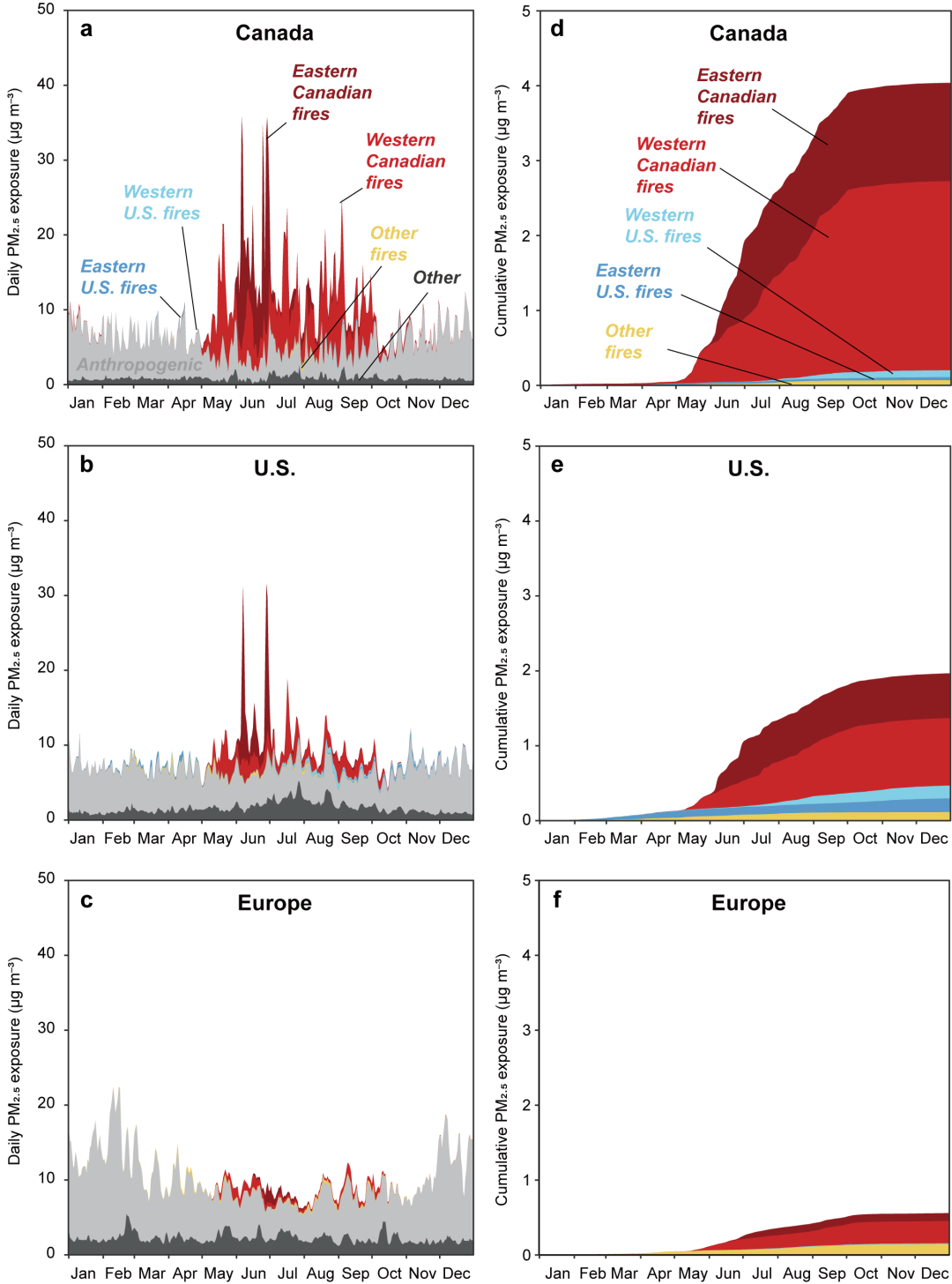 图3:2023年加拿大、美国和欧洲地区人群逐日PM2.5污染暴露水平及来源