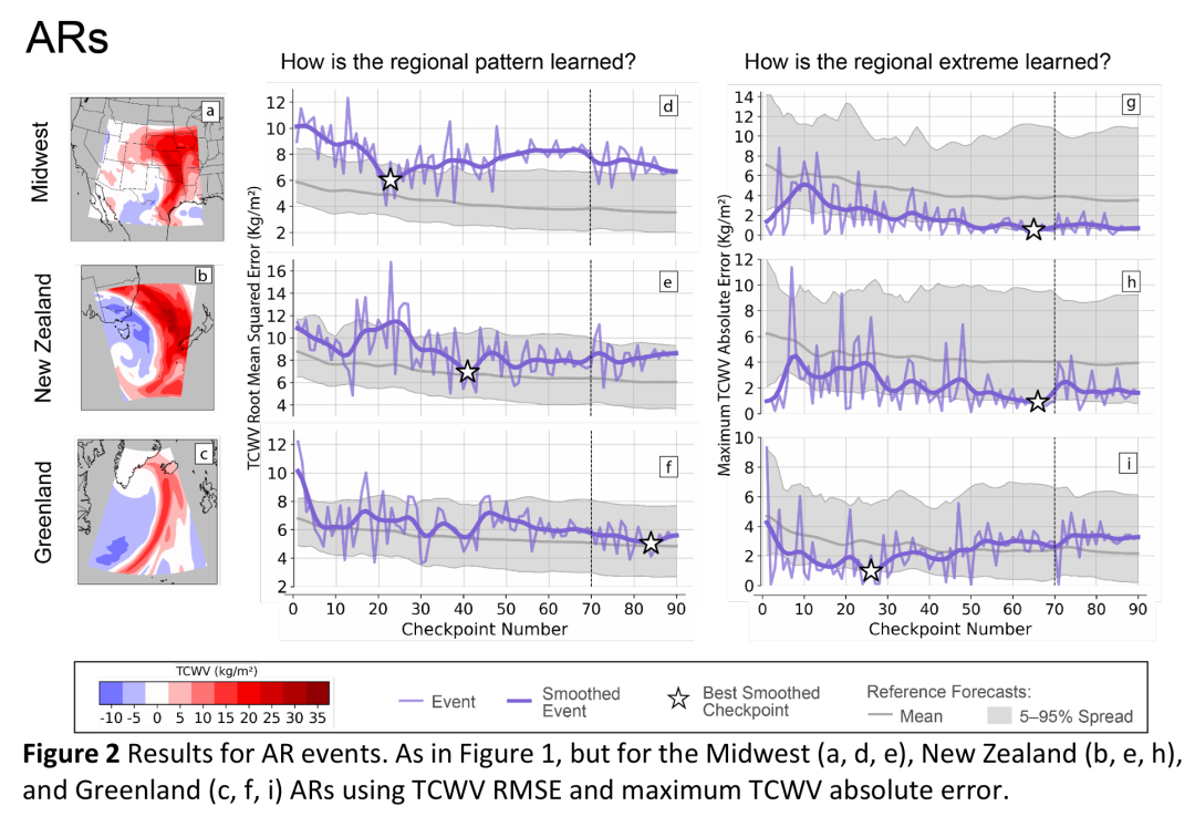 研究结果表明,AI天气模型在训练过程中并非均匀地学习所有天气类型。对于AR和TC这类具有强烈空间结构和极端值的事件,模型在早期就能捕获关键特征,但随着训练以最小化时间平均误差为目标,这些特征逐渐被平滑掉。这与Bonavita(2024)的观点一致:AI天气模型更适用于优化中范围平均误差,而非极端事件。