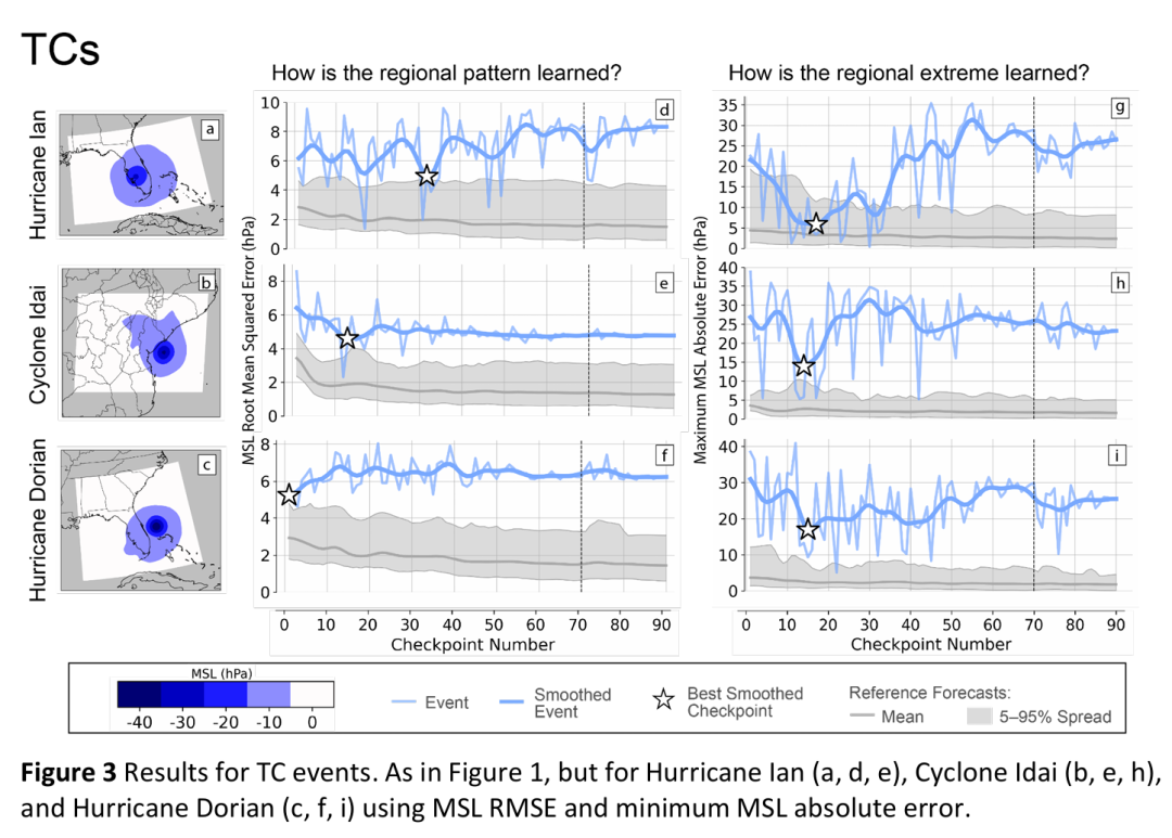 对每个事件和每个参考时间点进行5天(20个时间步)的预报推演,共生成90个预报结果。使用区域加权均方根误差(RMSE) 和极值绝对误差作为评估指标,并对90个检查点的误差进行高斯平滑处理,以识别趋势而非随机波动。