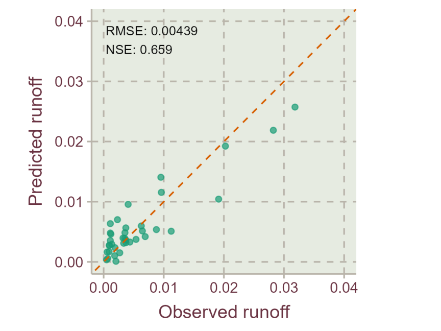 predicted <- model_data$predicted_runoff绘图1:观测值与预测值散点图