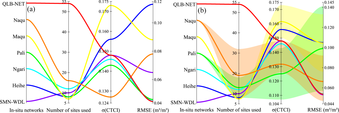 本研究还通过土壤水分产品真实性检验对比和随机抽取实验揭示了密集观测的优越性。基于QLB-NET的高密度观测,我们不仅在像元尺度上生成了“相对真值”,还将其用于主流卫星产品SMAP L3(36 km)的真实性检验中,并与青藏高原其他土壤水分传感器网络的验证结果进行对比(图8)。尽管QLB-NET区域的地表异质性程度最大,但在密集网络支持下,SMAP L3在本区的验证表现优异(升轨RMSE = 0.0446 m³/m³,降轨RMSE = 0.0536 m³/m³),与较为均匀但节点稀疏的阿里(Ngari)、五道梁(SMN-WDL)等区域相当,优于其他网络的验证结果,这表明密集而合理布局的传感器网络在提高像元尺度“相对真值”可靠性方面具有关键作用。