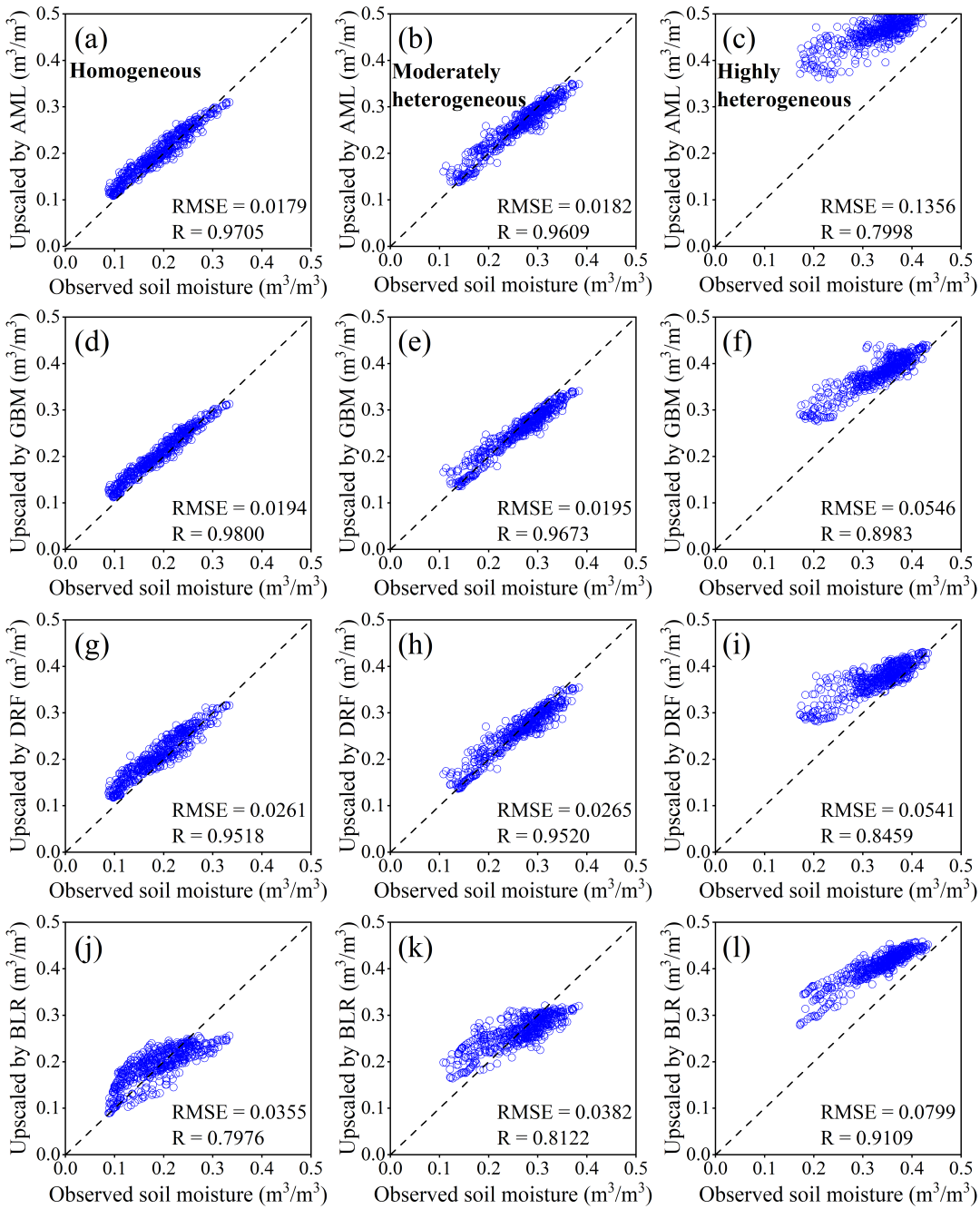 图4 (a-c)AML、(d-f)GBM、(g-i)DRF和(j-l)BLR四种方法尺度扩展结果与节点算术平均值的比较。第1至3列依次表示在均匀、中度非均匀和高度非均匀下垫面的结果