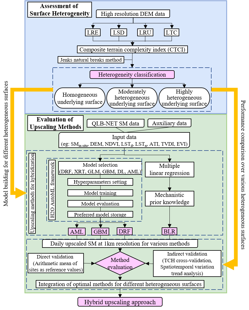本研究所使用土壤水分数据为2019-2022年非冻结期QLB-NET 5 cm深的日平均值,同时基于多源遥感数据得到用于尺度扩展模型构建的辅助变量(数字高程模型DEM、归一化植被指数NDVI、增强植被指数EVI、地表温度LST、表观热惯量ATI、温度植被干旱指数TVDI、儒略日DOY、经纬度等),通过“先分区、后优选”的混合策略实现1 km分辨率逐日土壤水分估算。图2为混合尺度扩展方法框架:首先用复合地形复杂度指标(CTCI)对区域进行地表异质性划分;其次在每类区域内部评估多种尺度扩展方法的性能;最后将每种异质性区域的最优方法集成为整体的混合方案。