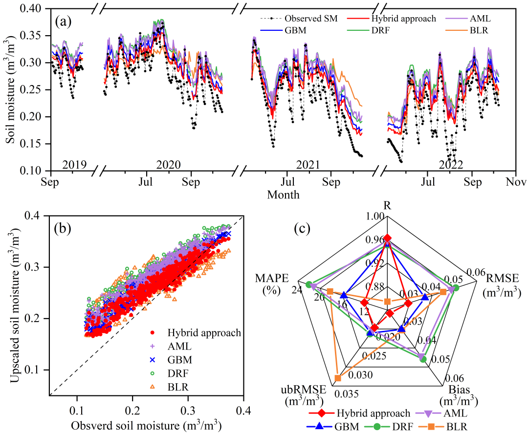 本研究构建的混合尺度扩展方法在精度与稳健性上均体现出显著优势。该方法利用了AML在均匀/中度非均匀下垫面的高精度与DRF在高度非均匀下垫面的稳健性,因而能够在异质性地表保持优良性能。图7显示了各种尺度扩展结果的比较,与若干单一方法相比,混合方案可将总体误差降低约 20.3%–42.0%,且能更好地反映土壤水分的实际波动情况。