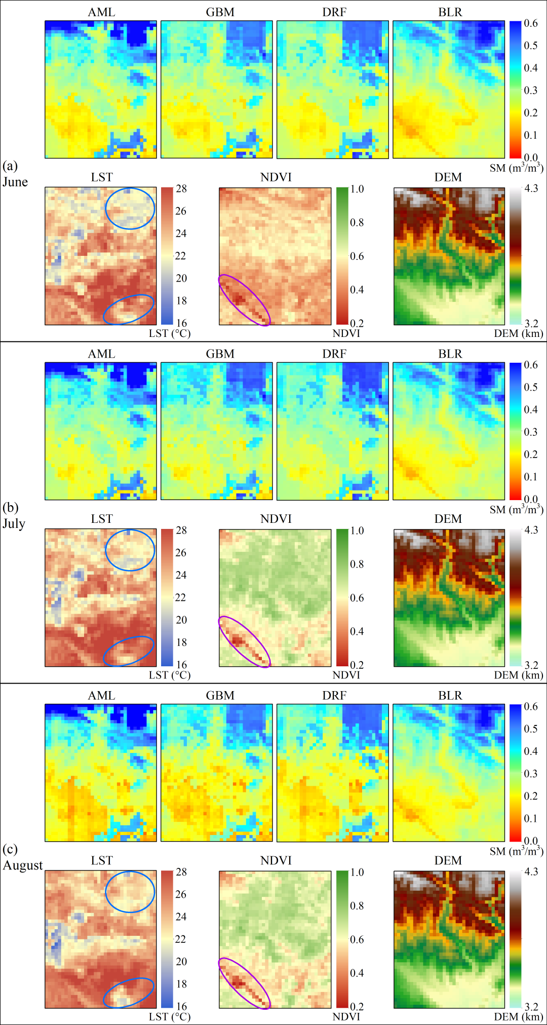 图6 QLB-NET区域像元尺度土壤水分及主要影响因子(LST、NDVI和DEM)的时空变化特征。蓝色椭圆部分表示两处湿润地区,紫色椭圆部分表示布哈河和城镇区域