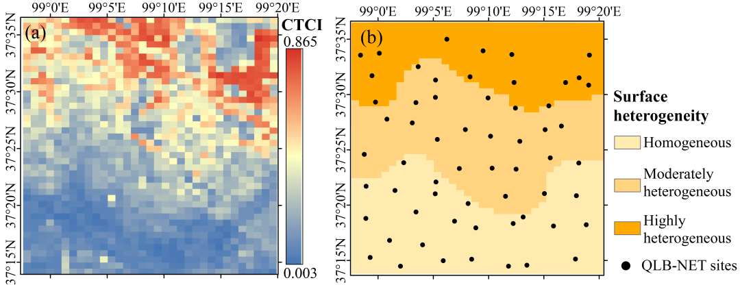 图3 研究区(a)复合地形复杂度(CTCI)分布以及(b)地表异质性分级