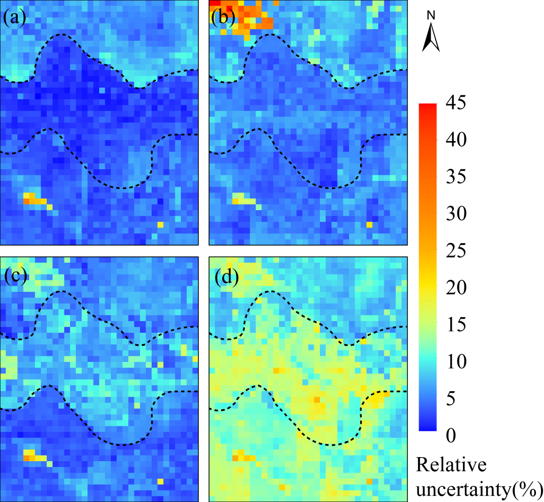 图5 基于Three-Cornered Hat的土壤水分尺度扩展结果相对不确定性的空间分布。(a-d)分别对应AML、GBM、DRF和BLR方法