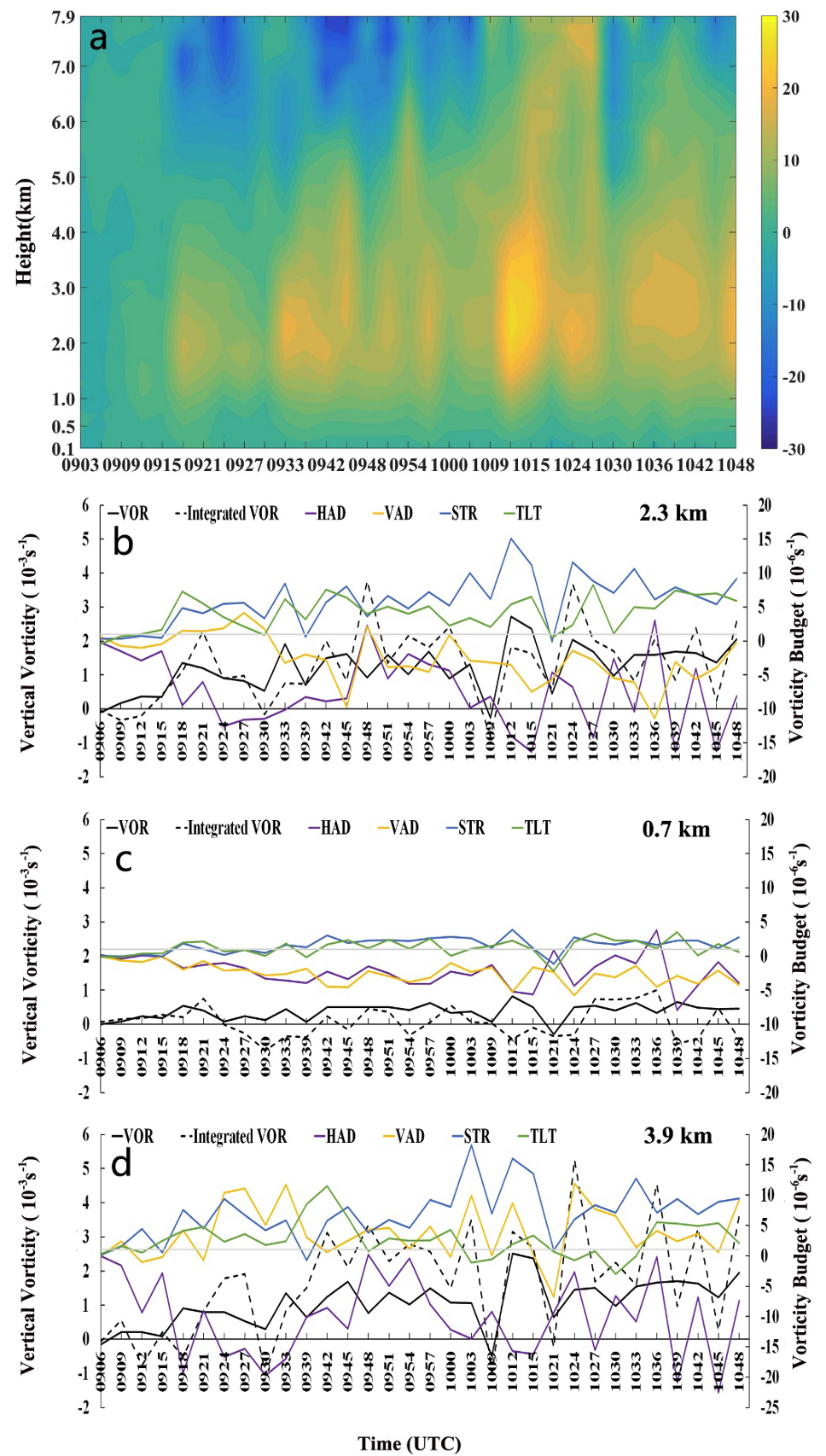 图6 (a) 涡旋中心范围的垂直涡度 (10-4 s-1) 时间—高度图;(b–d) 2.3 km、0.7 km和3.9 km高度的垂直涡度能量收支 (右侧Y轴) 和垂直涡度 (左侧Y轴) 时间序列图。