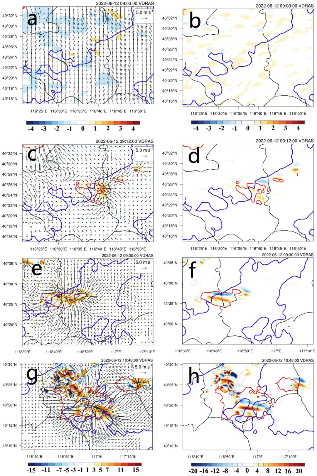 在对流单体尚未触发时,地形附近已经存在明显的辐合带和较小的垂直涡度值 (图5a, b)。0912 UTC,1.5 km高度的垂直涡度场可见对流单体前缘形成正、负涡度区,两者之间为强气流辐合 (图5c, d)。0930 UTC,合并过程导致2.3 km高度的辐合范围和强度明显增大,受南北气流的强辐合影响呈窄带状,正负涡度区增强且相互靠近 (图5e, f)。至1048 UTC,4.3km高度的辐合带随QLCS向东南方向移动,超级单体呈现“S”形流场,正负涡度区之间为强辐合带 (图5g, h)。以上结果表明,地面辐合线和发展的小涡旋增强了低层辐合与上升运动,使水平涡度转化为垂直涡度;而合并过程通过风场出流进一步强化低层辐合,有利推动了中气旋和超级单体的发展。