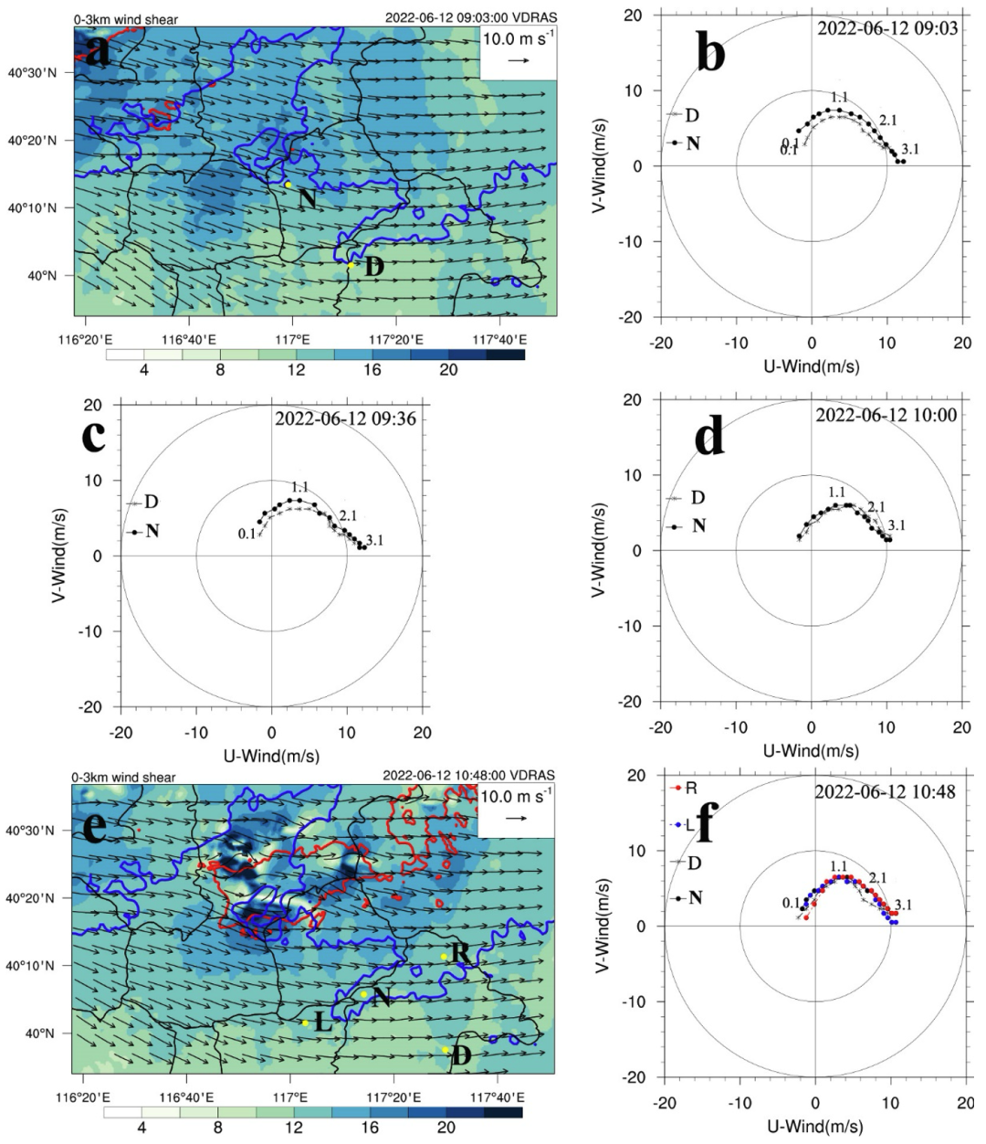图4 0–3 km垂直风切变大小、风切变矢量和风矢端图。红色等值线为30dBZ反射率。蓝色等值线为200 m地形高度。N和D为提取风矢端图的垂直风廓线位置。