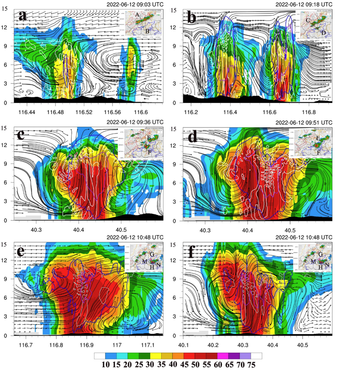 图3 沿图中各切线的VDRAS雷达反射率 (填色, dBZ) 和风场 (流线) 的垂直剖面。蓝色和紫色等值线为垂直速度(5, 20 m s−1) 。白色、棕色和灰色等值线是垂直涡度(1, 5, 10×10−3 s−1)。