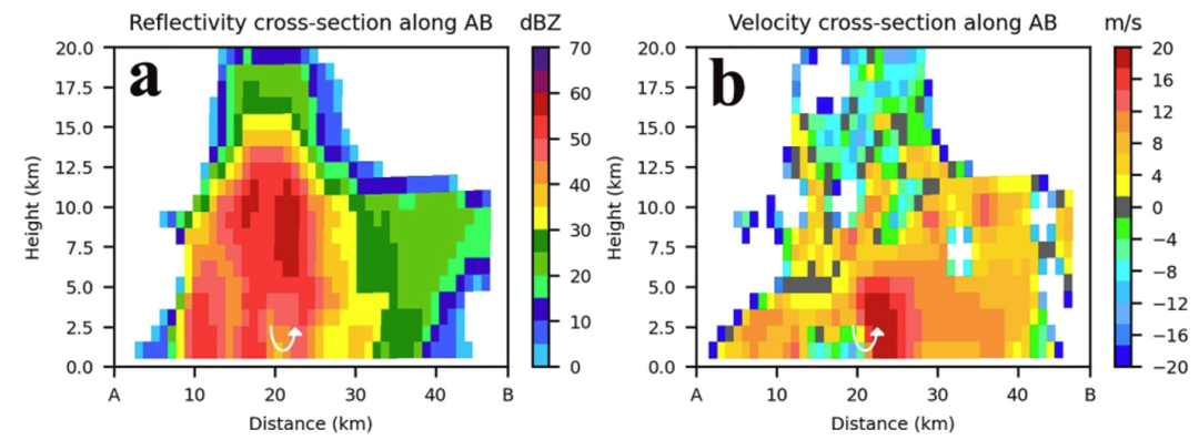 图2 沿图1中AB线的 (a) 雷达反射率和 (b) 径向速度的垂直剖面。白色箭头指示中气旋。