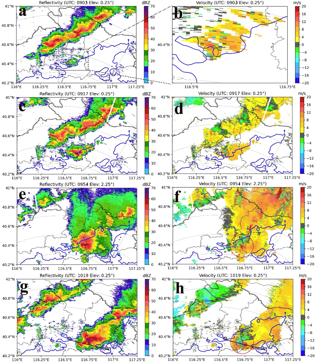 图1 各仰角层的 (左列) 雷达反射率和 (左列) 径向速度。蓝线是200m地形等高线。