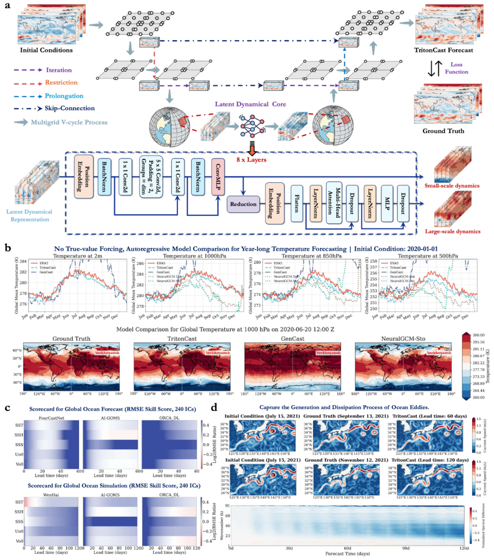 该研究提出的名为TritonCast 的AI预测模型,主结构如图所示,成功攻克了长期预测中的稳定性瓶颈,在多个领域展现出革命性的性能。清华大学黄小猛教授为通讯作者。