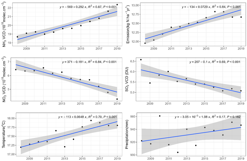 图2. 基于卫星的城市NH3 VCD趋势及潜在驱动因素(NH3排放、NO2/SO2、温度和降水)。全球范围内通过IASI获取的NH3 VCD趋势,数据为所有城市聚集区的平均值。这里展示的潜在驱动因素包括NH3排放、NO2和SO2的VCD、降水量(毫米)和温度(摄氏度)。中国、美国、西欧、南美和非洲等地区的趋势可以在图S9–S11中找到。