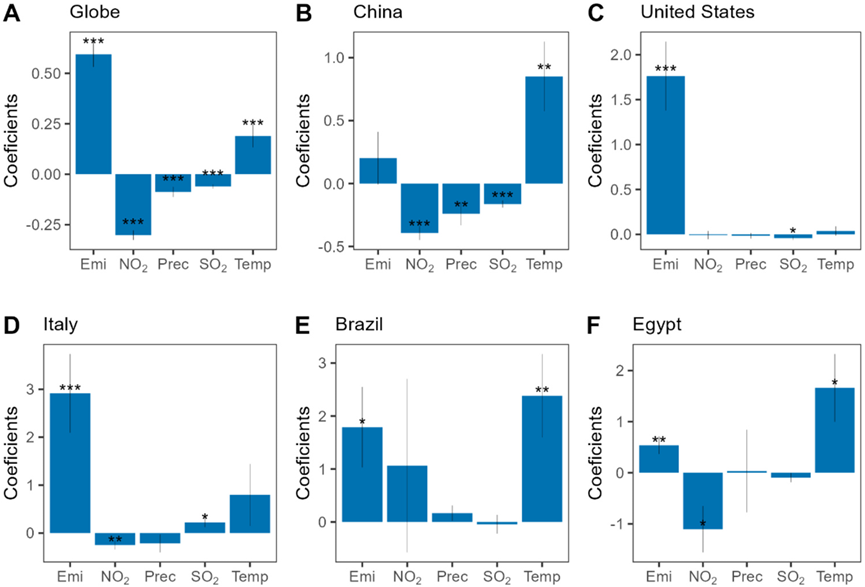 图3. LME(线性混合效应)模型的系数,城市NH3 VCD作为自变量,因变量包括NO2 VCD、降水量、空气温度和NH3排放。A,包含所有全球城市聚集区的LME模型系数;B-F,分别为中国、美国、意大利、巴西和埃及等子地区的系数。误差条表示每个系数的标准误差。显著性:*** < 0.001, ** < 0.01, * < 0.05。