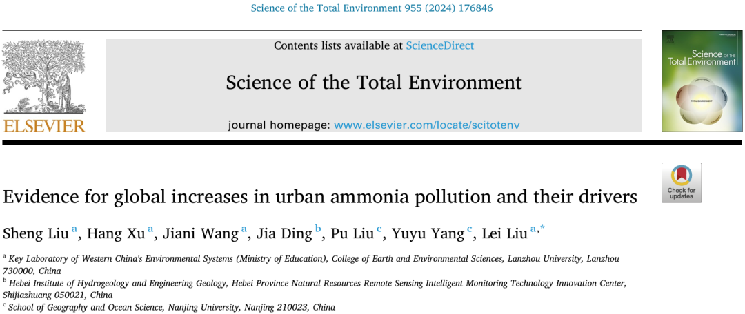 论文信息 Sheng Liu, Hang Xu, Jiani Wang, Jia Ding, Pu Liu, Yuyu Yang, Lei Liu*. Evidence for global increases in urban ammonia pollution and their drivers. Science of the Total Environment. 2024