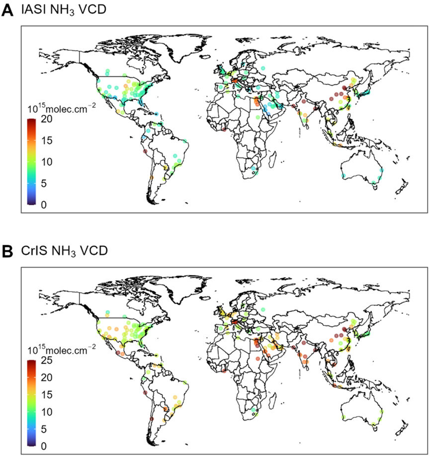 图1. 2013年和2018年全球城市NH3 VCD的平均值。A,城市聚集区(>200 km²)上的IASI NH3 VCD。这里显示了每个城市聚集区的中心点,其边界可以在图S2中找到,数据基于卫星夜间稳定光数据(Zhou等,2015年)获取;B与A相同,但使用的是CrIS卫星的数据。