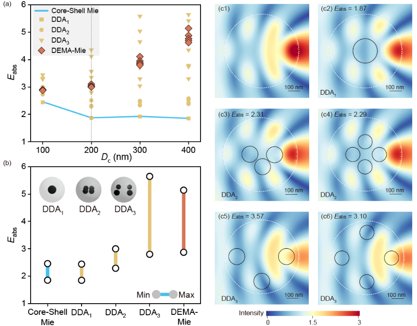 图3 Core-Shell Mie、DEMA-Mie以及DDA模拟结果对比以及电场模拟表征颗粒内部能量的非中心分布特征