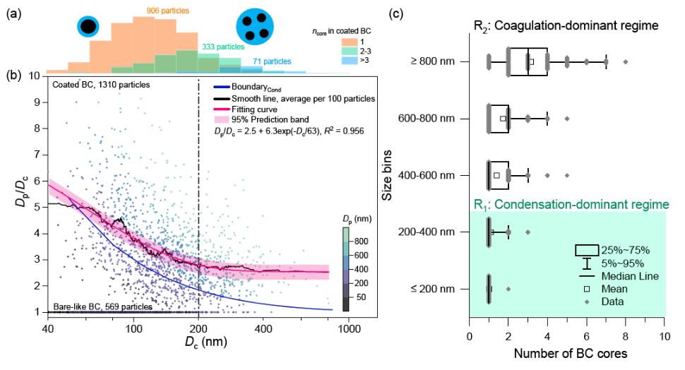 多碳核颗粒的发现直接挑战了已有研究认为的以凝结主导的黑碳老化机制,首次在外场中为碰并老化机制提供了观测证据(图1)。碰并的随机性和尺寸依赖性,主导了Dp>400 nm以上颗粒的混合态(Dp/Dc)变化,碰并机制对于老化的贡献不应该在模式评估和观测解析中被忽略(图2)。此外,已有研究广泛认为厚包裹的黑碳来自生物质燃烧的大黑碳在传输过程中极端老化,而本研究进一步指出并不仅是充分的老化时间,更是由于碰并的存在导致多个含黑碳颗粒合并成一个积聚模态的颗粒,从而颗粒中黑碳累计的当量直径Dc > 200 nm,而基于质量或者光学的在线仪器不能从Dc反推碳核数。
