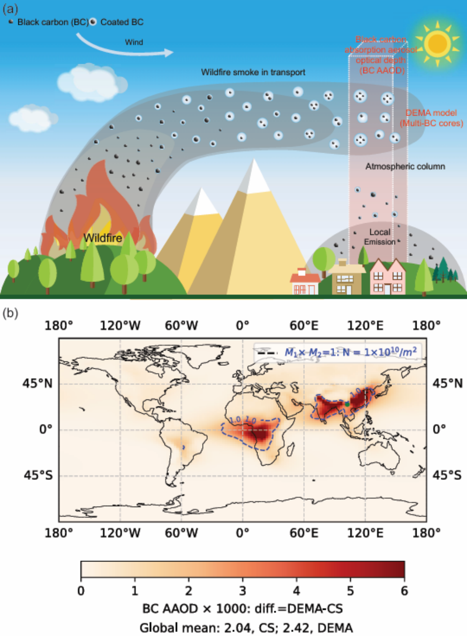 黑碳气溶胶是影响地球气候系统的关键因子,但其气候效应评估长期存在一个巨大谜团:全球模型模拟的黑碳吸光能力(BC AAOD)始终比观测值低约50%。打破传统单一核壳结构,我们首次发现长距离传输的野火烟雾中存在大量具有多碳核结构的颗粒。基于大气模式+AI,把多核模型嵌入全球模式,发现提升了BC AAOD模拟的19%。