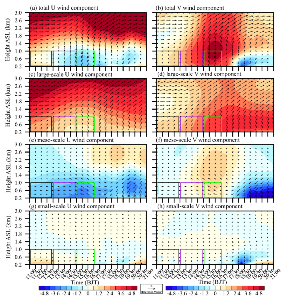 图1.Barnes滤波方法分离的多尺度风场(填色,单位:m/s),风矢量(箭头,单位:m/s)的高度-时间演变图