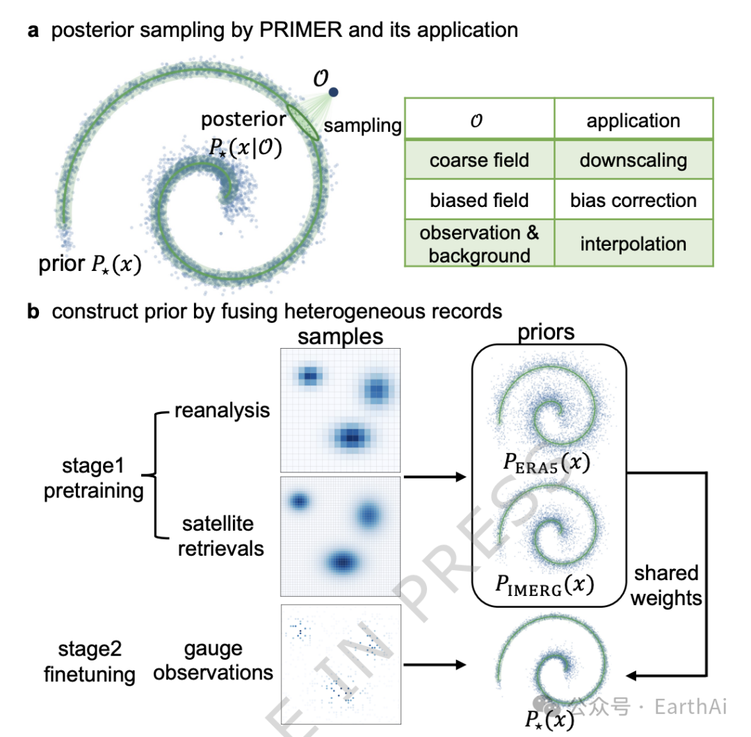 在这⼀背景下,中国科学院⼤⽓物理研究所潘宝祥副研究员与清华⼤学林岩銮教授团队,联合河海⼤学⽔⽂⽔资源学院李⽂韬副教授、中⼭⼤学⼤⽓科学学院李璐副教授、中国科学院⻘藏⾼原研究所李新研究员,以及美国加州⼤学欧⽂分校教授、美国国家⼯程院院⼠Efi FoufoulaGeorgiou,在Nature Communications发表论⽂"Fusion of multi-source precipitation records via coordinate-based generative models",提出了PRIMER框架。PRIMER的全称是 Precipitation Records Infinite MERging,它采⽤坐标式扩散⽣成模型,在先验、似然、后验的⻉叶斯框架内融合多源降⽔记录,并以后验采样统⼀实现偏差订正、降尺度与背景加观测的融合分析等任务,展示了⼀个可迁移、可复⽤的⽣成式数据融合范式。